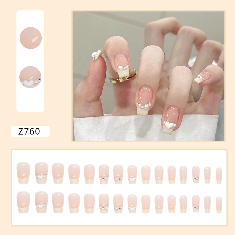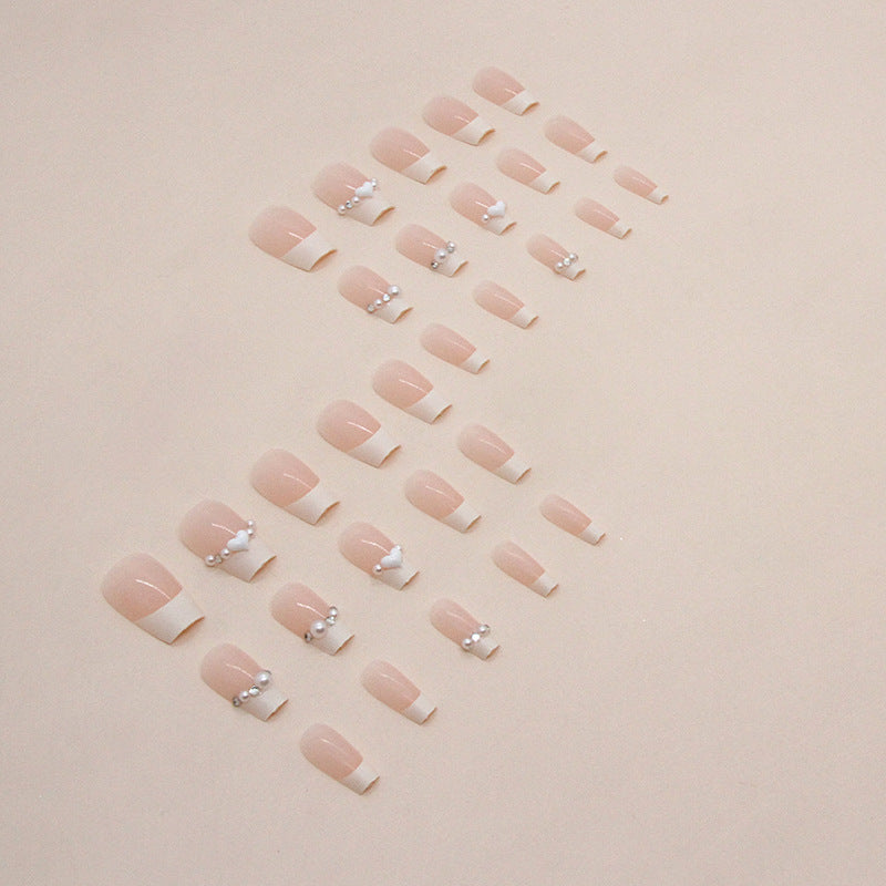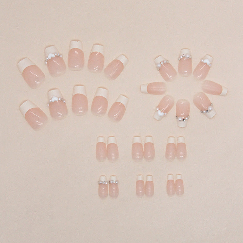N-166 - White Pearl & Heart - Press On Nail Set Of 24
