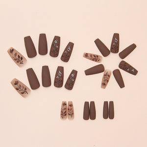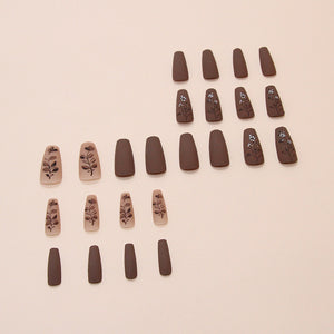 N-243- Caramel Chocolate Flower - Press On Nail Set Of 24 - Free 24 Pcs Sticker Sheet Included