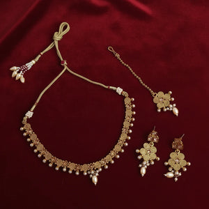 PJ-128 - Premium Gold Pearl Pink Diamonds Flowers - Jewelry Set