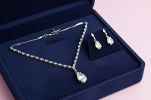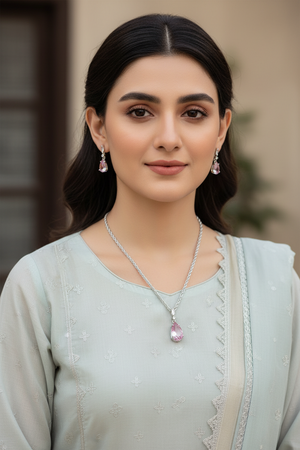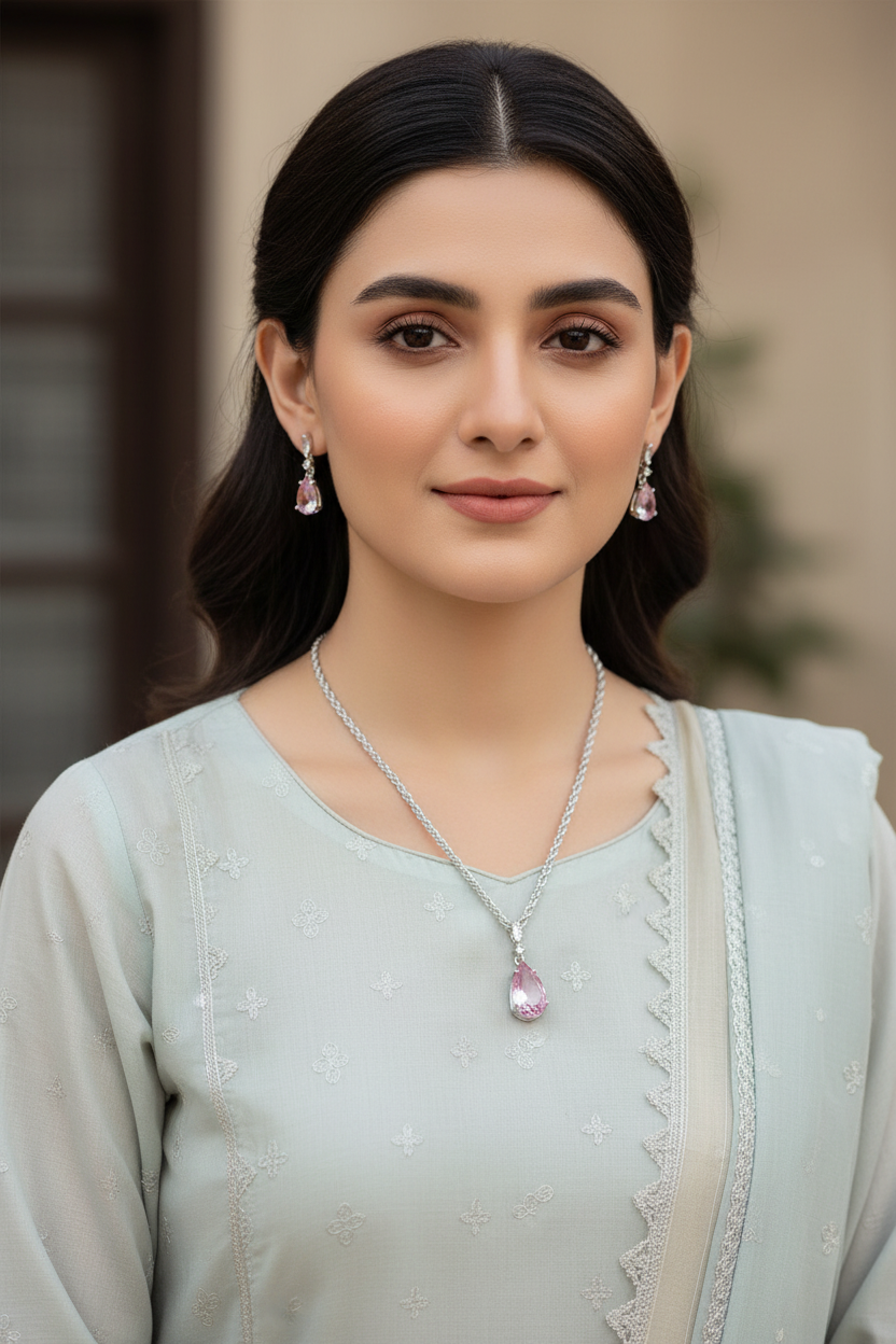 PJ-133 - Crystal Pink Natural Stone Rain Drop Diamonds Silver - Jewelry Set Of 2
