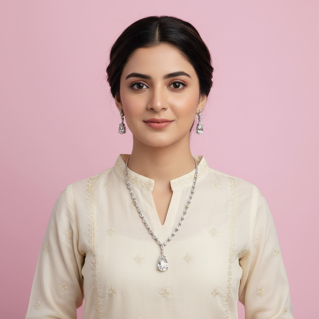 PJ-134 - Crystal White Natural Stone Rain Drop Diamonds Silver - Jewelry Set Of 2