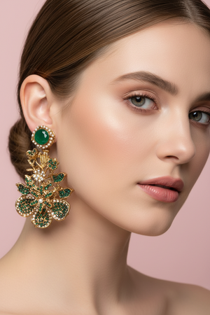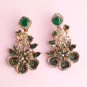 PJ-143 - Emerald Green Diamonds Flower Vintage Gold - Earring