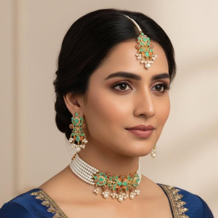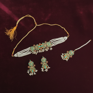 PJ-154 - Mint Green & Gold Mala - Jewelry Set