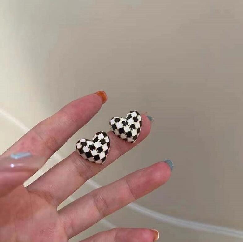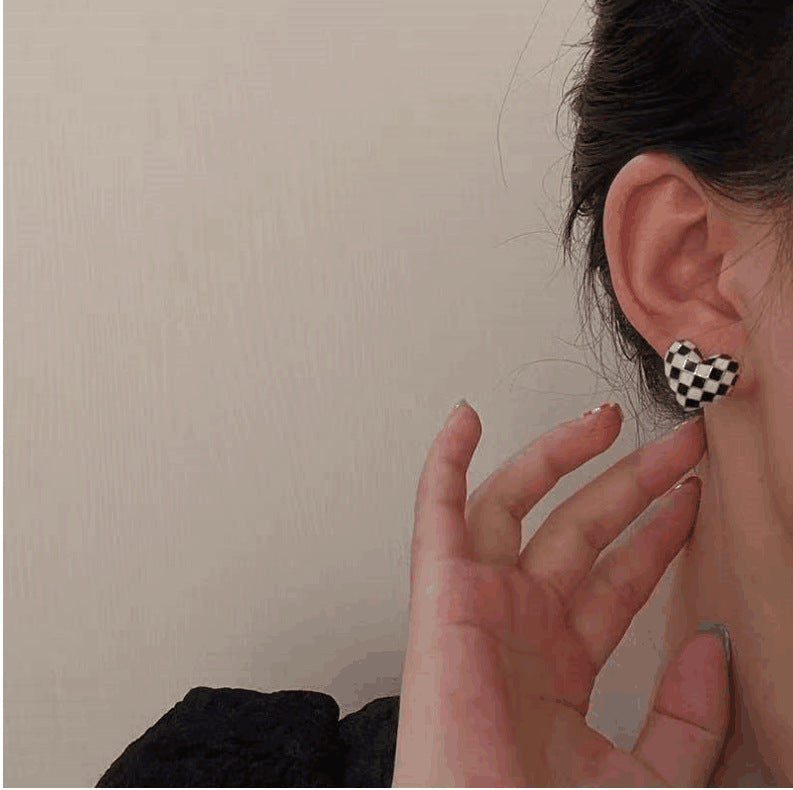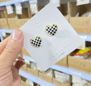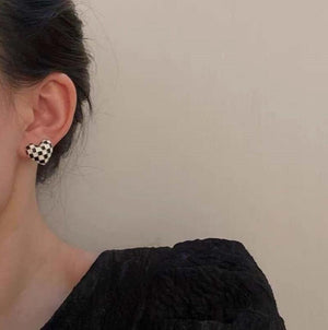 UNI-10127 - Black & White Grid Heart Gold - Earring