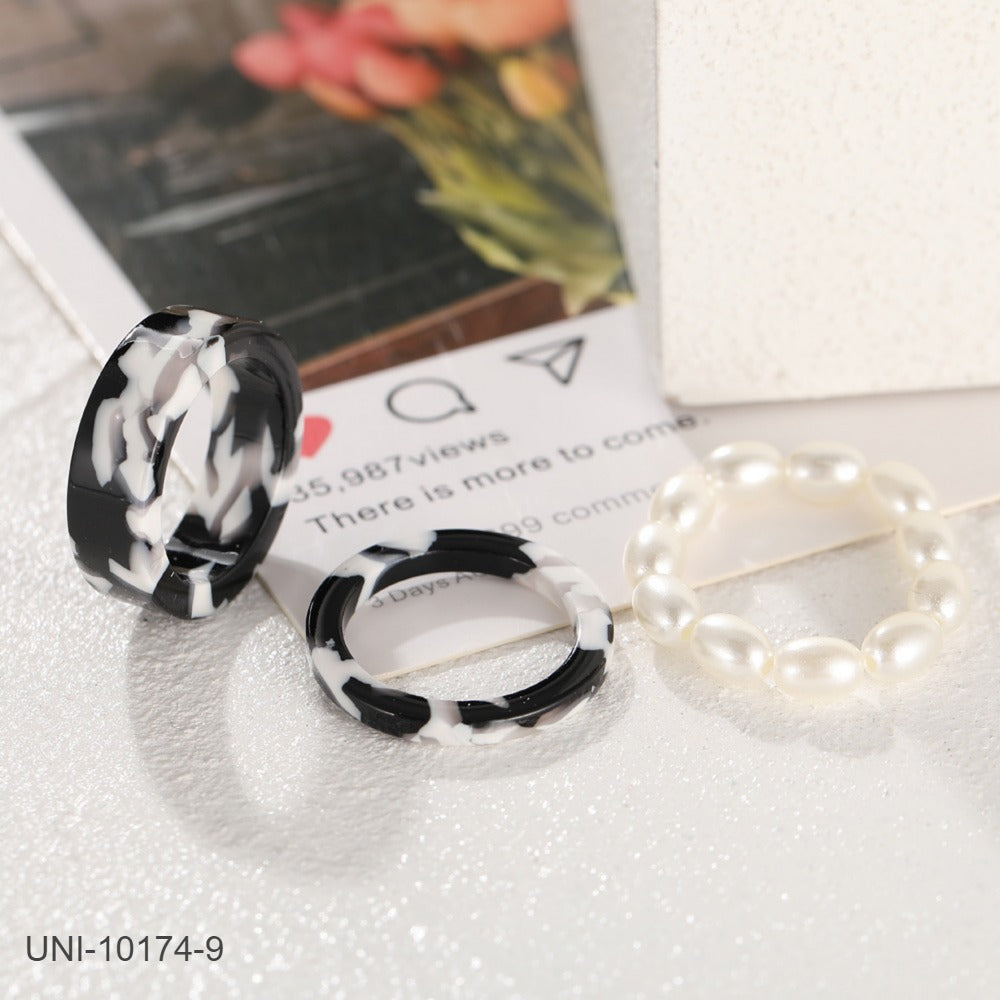 UNI-10174-9 - Pearl & Acrylic Black Marbled - Ring Set of 3