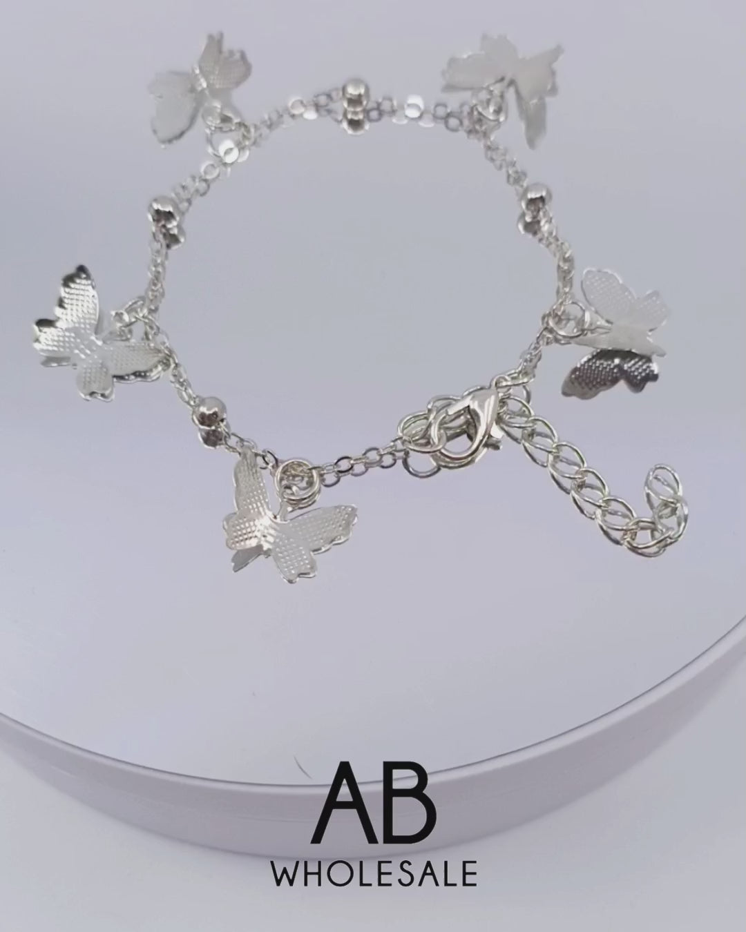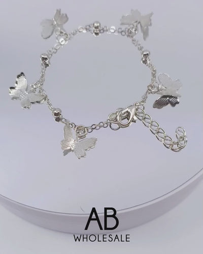 Fly into style. With five charming butterfly charms hanging from a fine silver chain, this Butterfly Charm Silver Bracelet is the perfect accessory for anyone who loves a touch of whimsy in their jewelry. The butterflies flutter around your wrist, adding a playful yet elegant feel to any outfit. Whether you're dressing up for a special occasion or simply adding a fun twist to your everyday look, this bracelet will make a lighthearted, yet sophisticated statement.