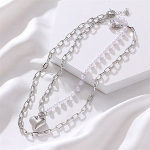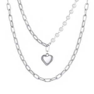 UNI-10900 - Double Layer Pearl Heart & Chain Silver - Necklace