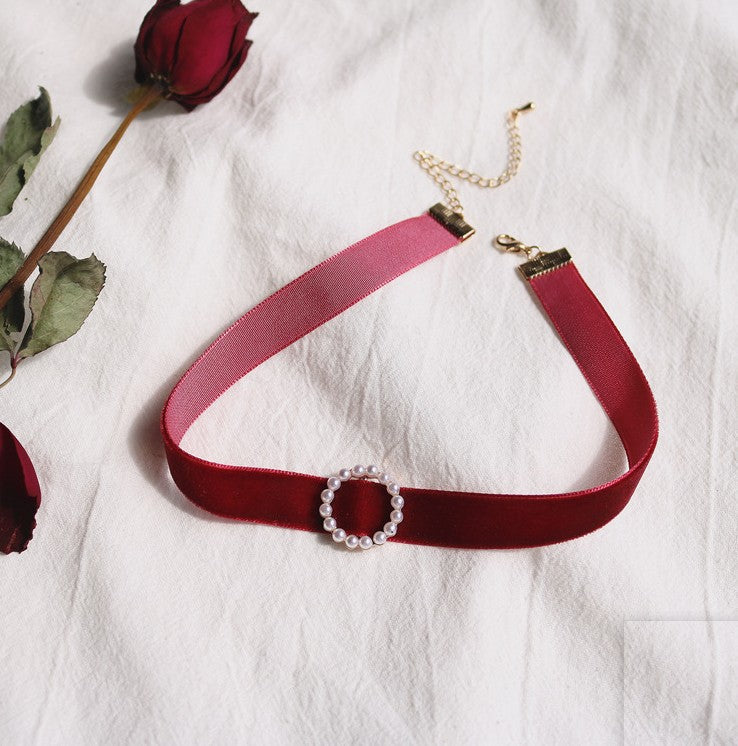 UNI-10990 - Maroon Velvet Neck Round Pearl - Necklace