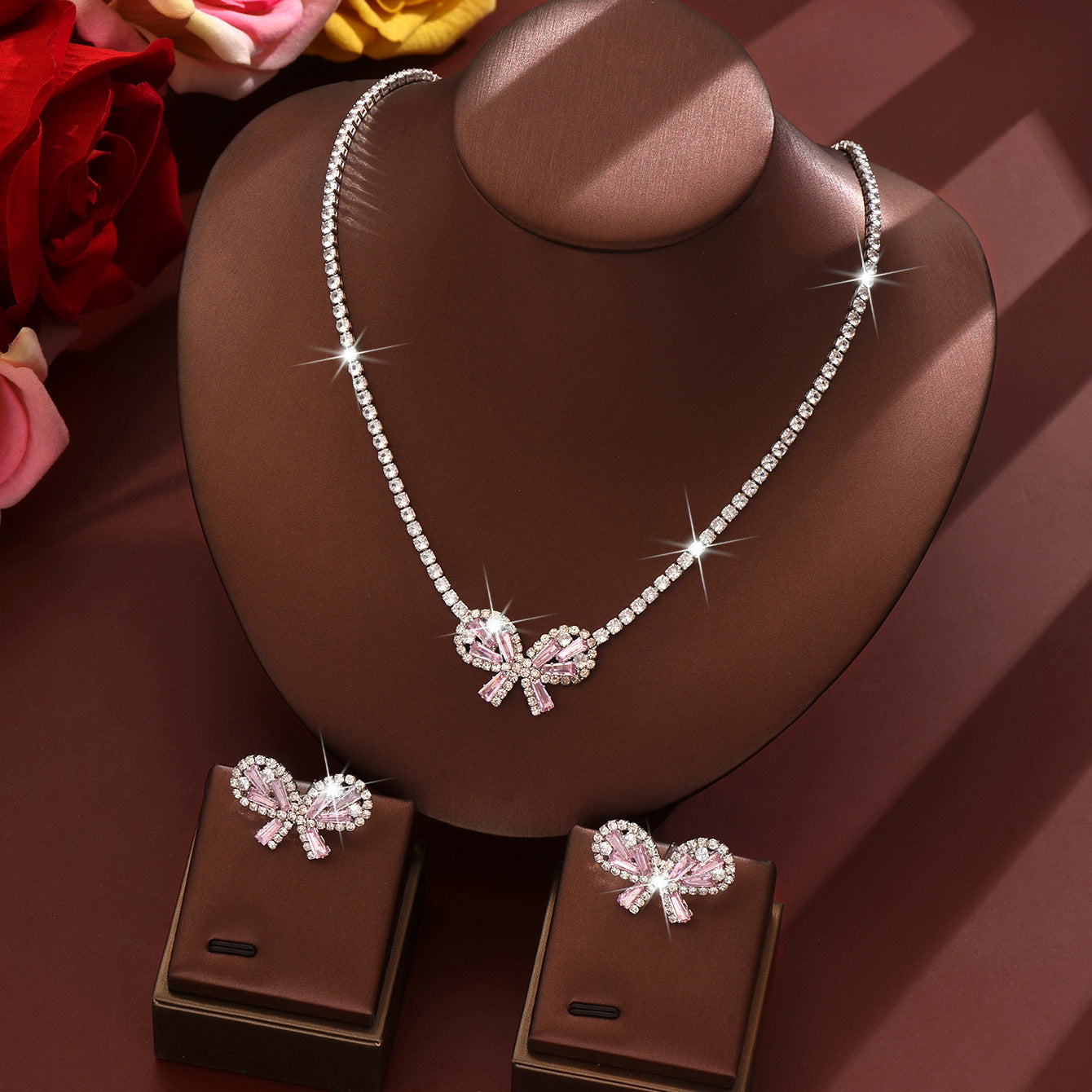 UNI-11380 - Pink Fancy Bow Diamonds Silver - Jewelry Set